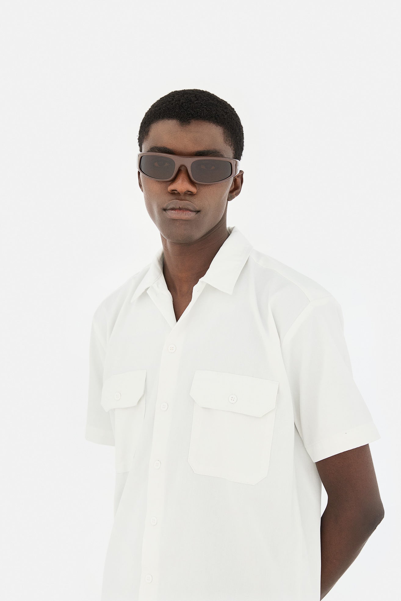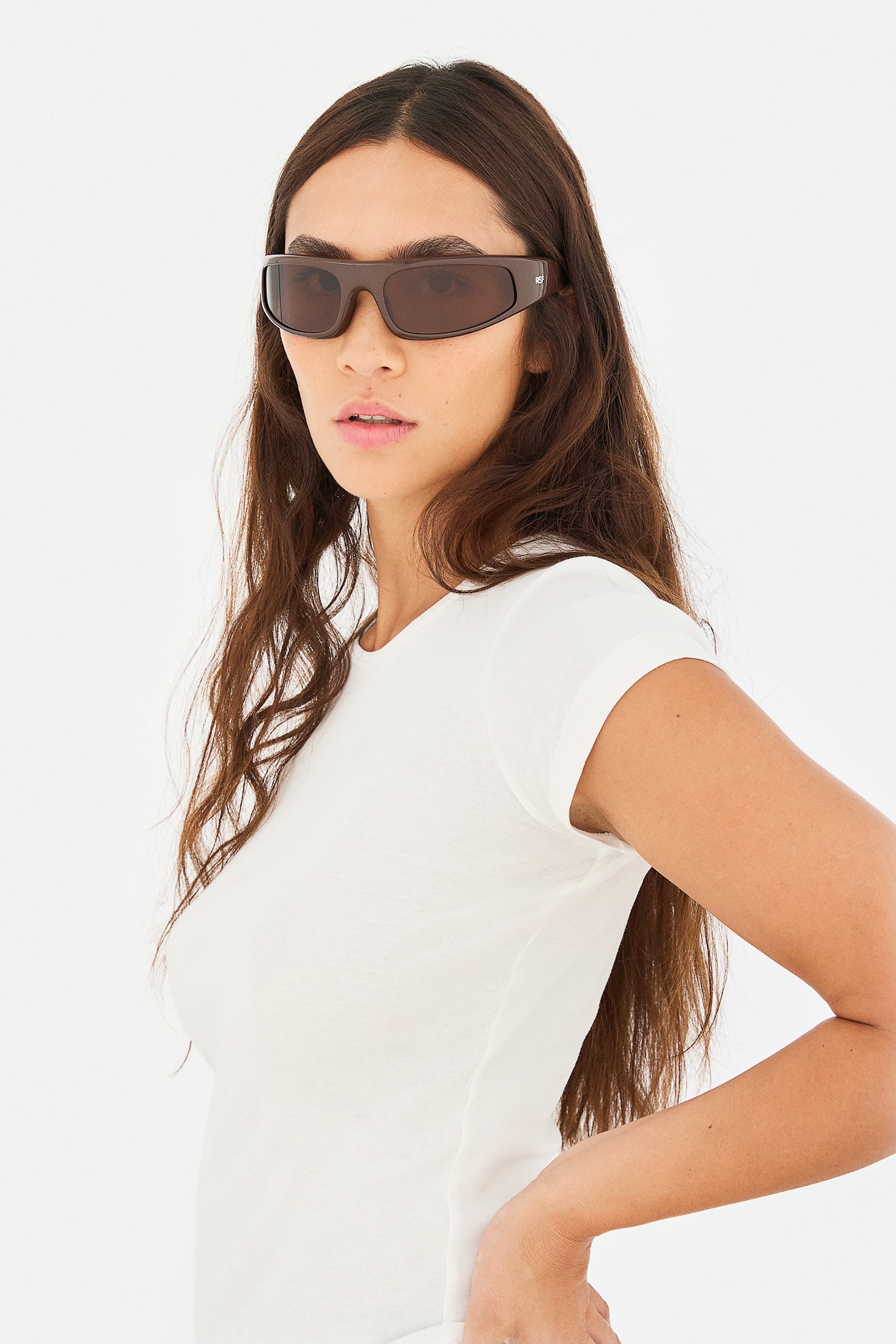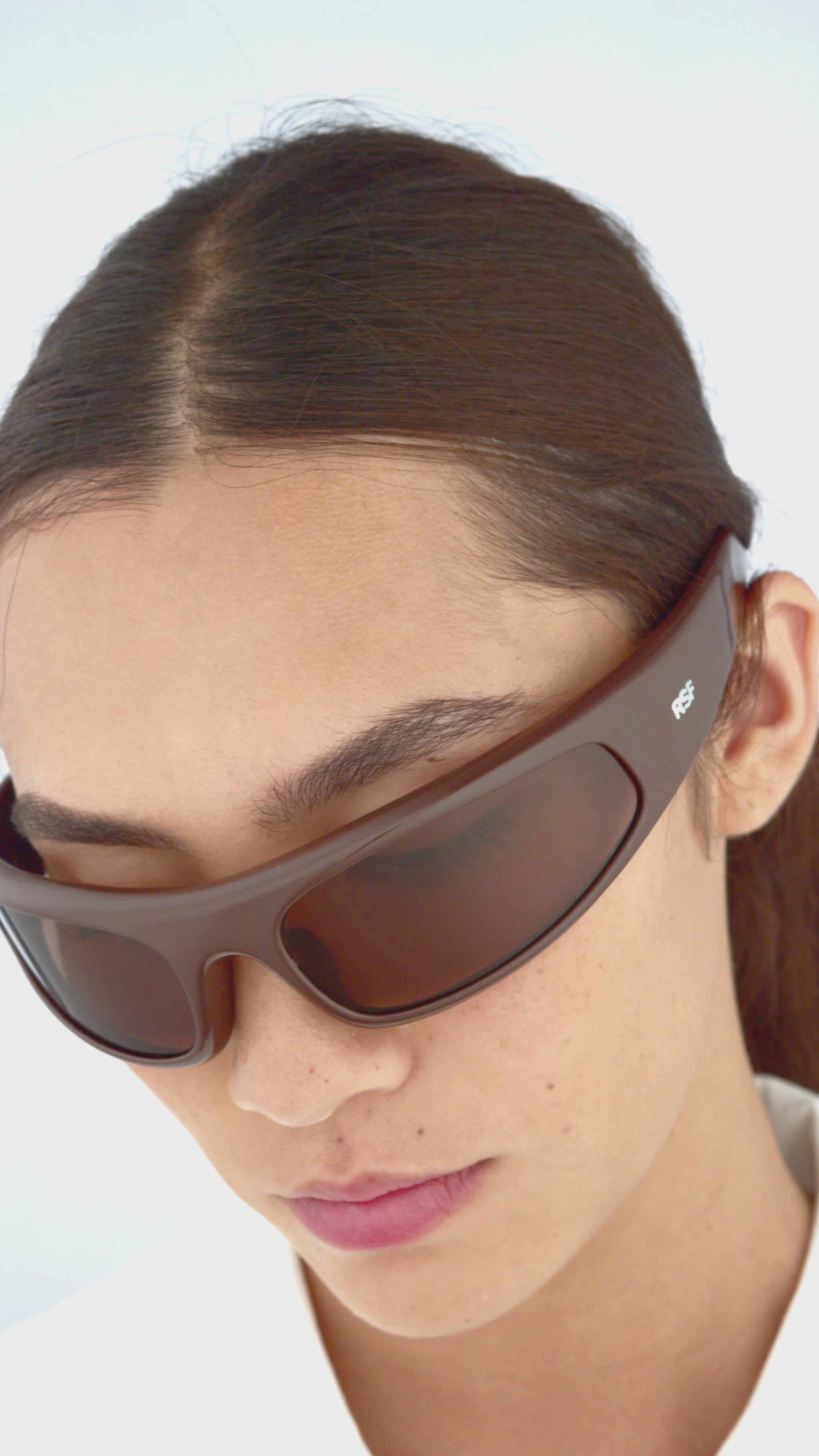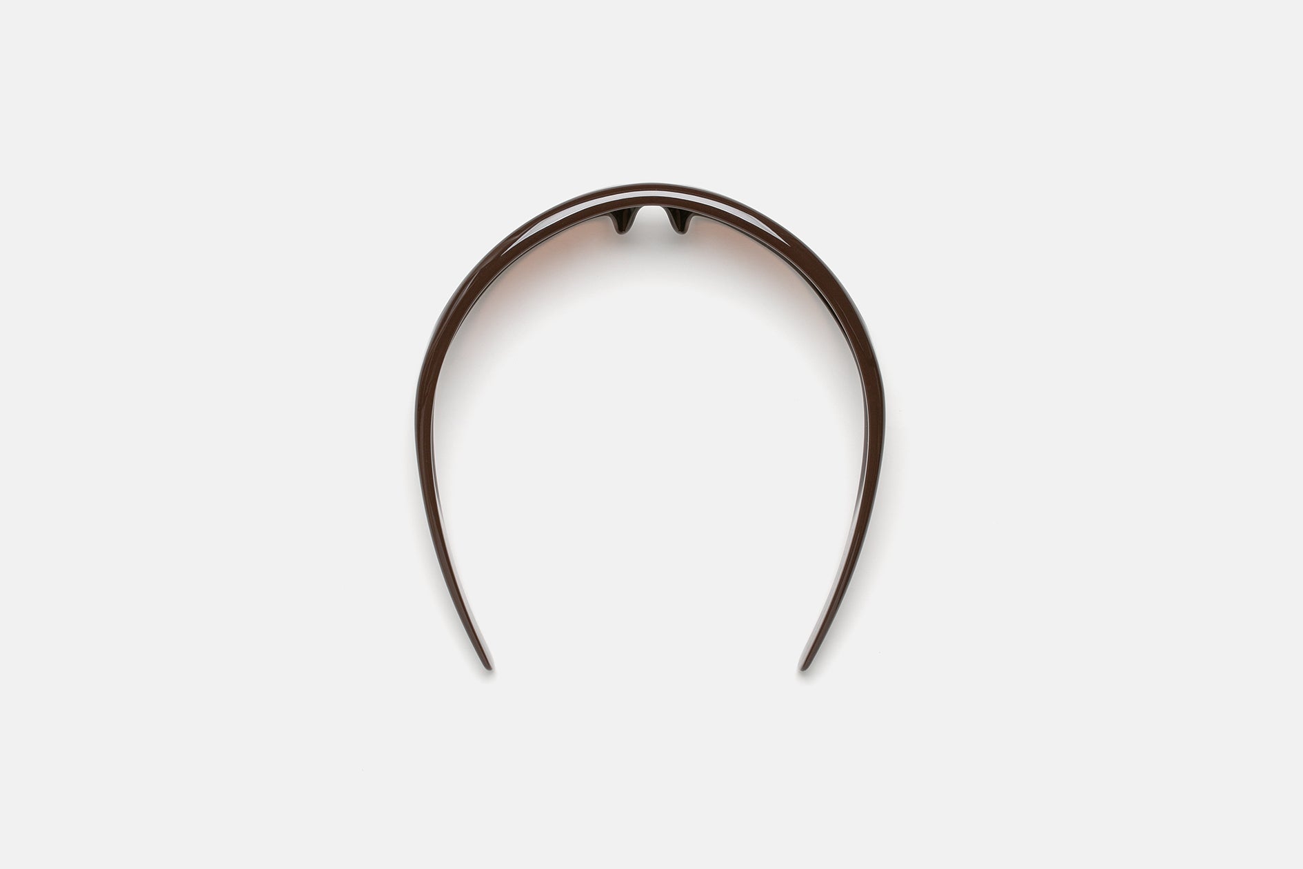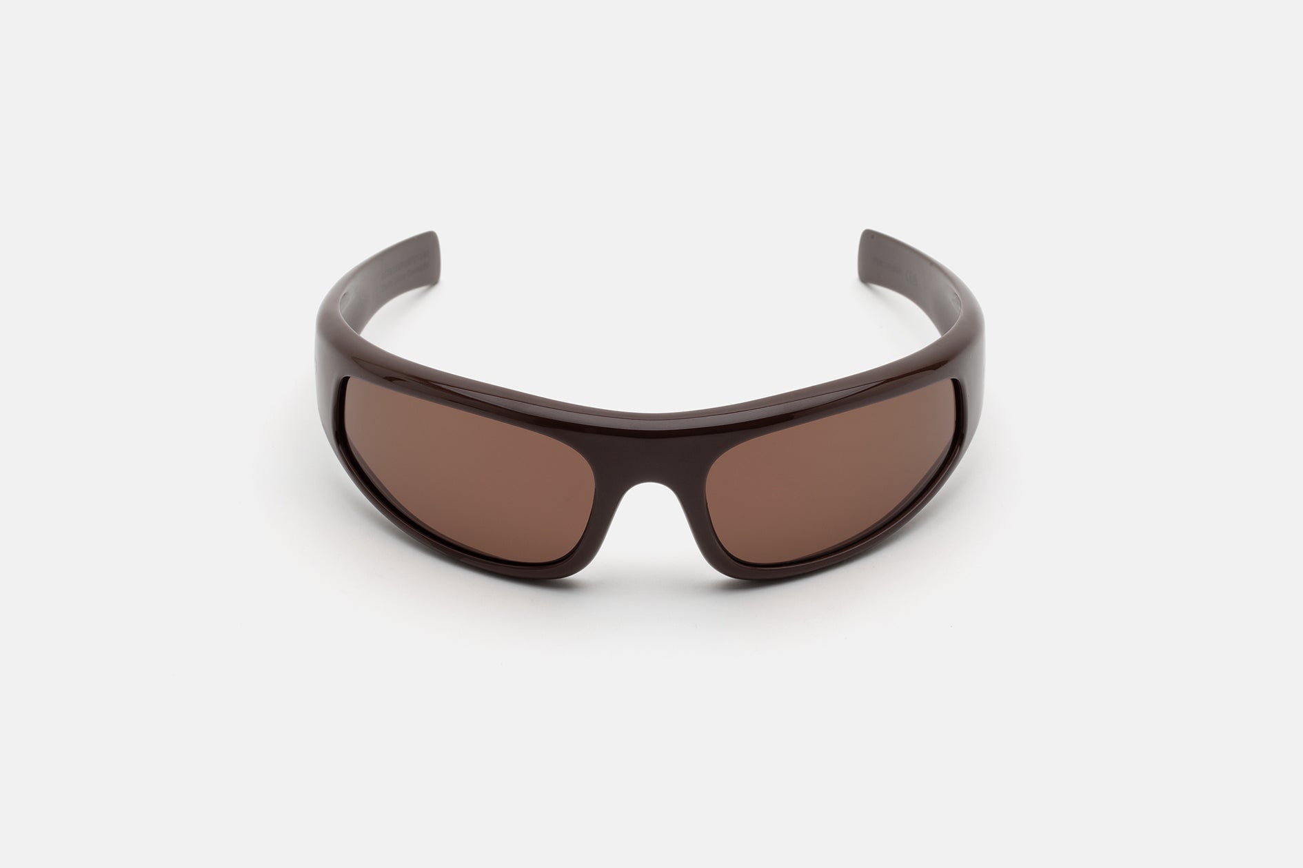 Custom made semicircle, lightweight and hingeless chocolate brown nylon frame. Mounting tone-on-tone wrap around lenses in brown. Premium eyewear designed in Milano, Italy.