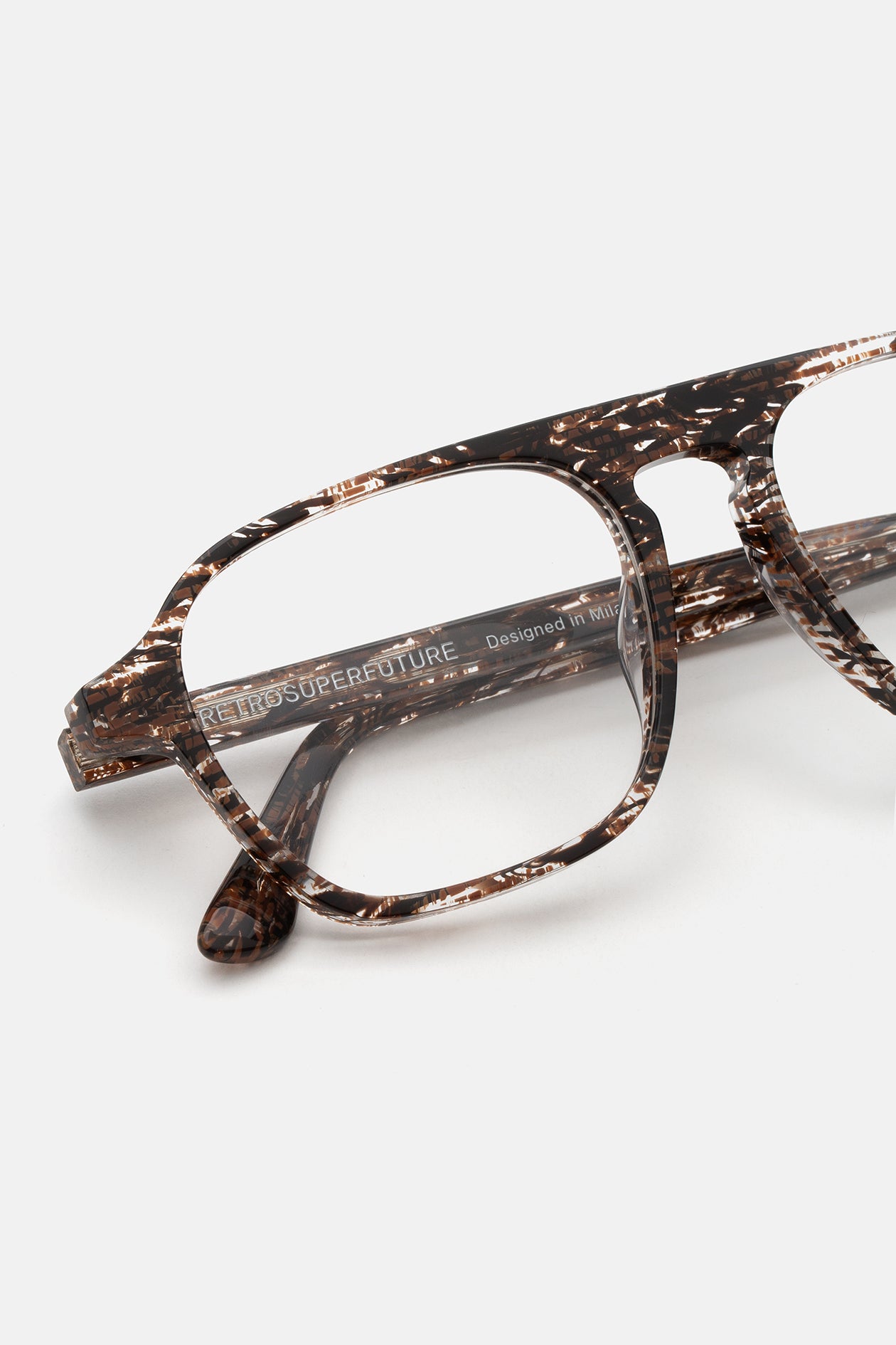 High grade Italian acetate in a unique pattern acetate. Mounting clear display lenses in base 4. Prescription lens not included. Premium eyewear designed in Milano, Italy.